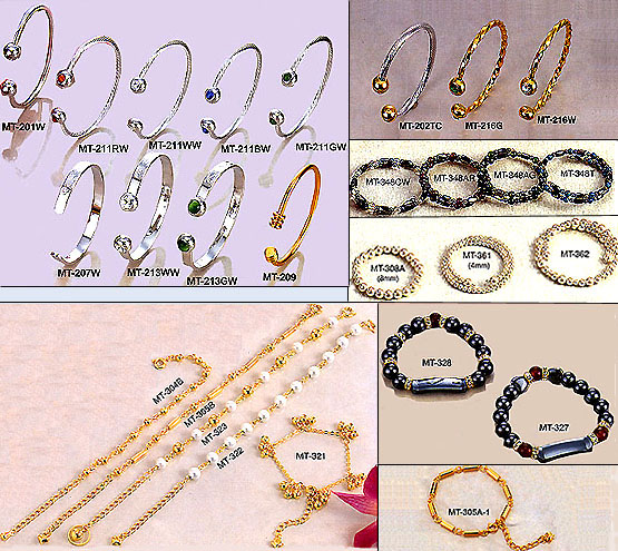 係由鐵氧體磁珠經拋光、烤漆或染色,搭配水鑽、半寶石等設計,以鬆緊絲或鋼線組穿而成。其中切角珠組成的手環,其多邊切面之外觀,光芒四射,攝動人心,媲美真鑽。鬆緊絲組穿之手環,佩戴方便,深受消費者喜愛。鋼線組成之手環,其佩戴方式多變,除穿戴於腕部,亦可佩戴於踝部、手臂,甚至是頸部,一款數用,除保健外,可完全展現您獨特之氣質及丰采。