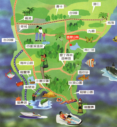翡翠山林位於屏東縣200號道路,從恆春往滿州經旭海接壽卡直通台東,將恆春半島與花東海岸連成一線。